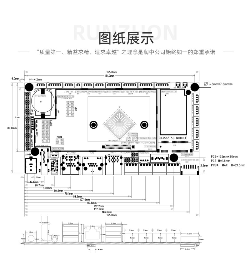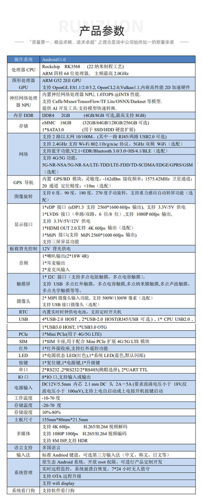 0T-2168K 高性能智能主板,采用瑞芯微 RK3568 高性能 AI 處理器、神經網絡處理器 NPU, Android 11.0 操作系統, RK3568 是基于四核 A55 采用全新 22nm 工藝的 ARM v8.2-A 架構四 核 64 位 CPU,主頻高達 2.0GHz,擁有超強的通用計算性能,GPU 采用 ARM G52 2EE,CPU 內部 集成 AI 神經網絡處理器 NPU,運算性能高達 1.0TOPS,支持多種 AI 開發工具和接口。支持三 屏異顯功能,支持 LVDS 接口 1080P 輸出,eDP 和 MiPi 顯示接口輸出,HDMI-4K 輸出, 支持雙百兆以太網, WiFi, USB 擴展/重力感應/ CAN/RS232/RS485/IO 擴展/補光燈/I2C 擴展 /MIPI 攝像頭/紅外遙控器等功能,豐富的接口,一個全新四核擁有超強性能的人工智能芯片 讓產品變得更加完美,被廣泛的應用到 AI 服務器、人臉支付設備、安防、醫療、交通、金 融、工控、智慧教育、智能零售等等 AI 智能領域。由于其硬件平臺化、Android 智能化的 特點,在需要進行人機交互,網絡設備交互時,都可以在智能終端主板上進行使用。